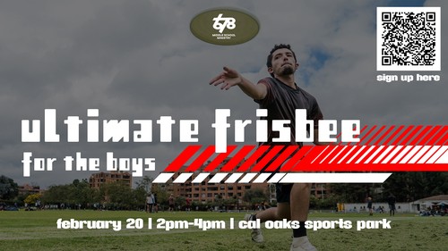 Join us for our Boy's Ultimate Frisbee from 2pm-4pm at Cal Oaks Sports Park. Look for the 678 by Shivela Middle School and the baseball field. Wear your sneakers or plastic cleats, and we will see you then!