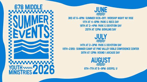 Welcome to 678 Middle, where middle-schoolers can be themselves, have fun, and learn about Jesus! As we share our lives with your middle-schoolers through fun games, Bible studies, small groups, camps and events, we will learn how to love God and love people together.