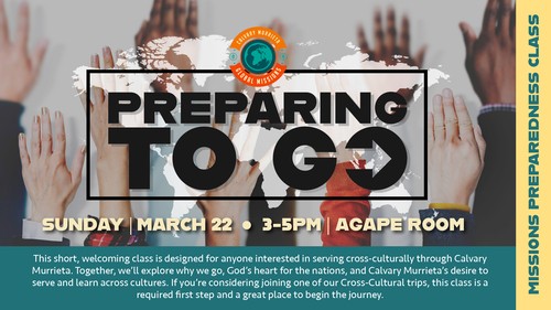 This short, welcoming class is designed for anyone interested in serving cross-culturally through Calvary Murrieta. Together, we’ll explore why we go, God’s heart for the nations, and Calvary Murrieta’s desire to serve and learn across cultures. If you’re considering joining one of our Cross-Cultural trips, this class is a required first step and a great place to begin the journey. The class will be held next Sunday, March 22nd from 3-5 PM in the Agape Room.
