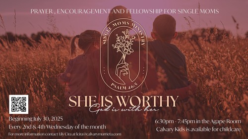 We are excited about this new fellowship called She Is Worthy for single moms! Based on Psalm 46:5, our mission is to create a Christ-centered community where single mothers are uplifted and encouraged through faith, fellowship, and support. Our desire is to find strength in God, build lasting friendships, and grow in purpose as women and moms. We will be meeting the 2nd and 4th Wednesday of every month from 6:30-7:45pm in the Agape Room. Calvary Kids is available for all ages. We will begin on July 30th.
