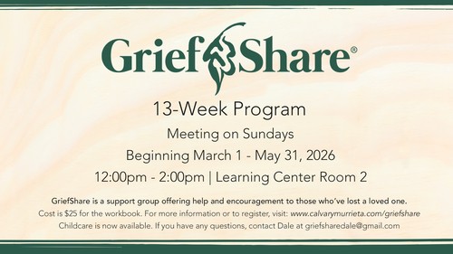 We are so fortunate to be able to offer support and hope for those here who are grieving the death of a loved one. We call it GriefShare. Don’t go through the grieving process alone. Are you broken-hearted, struggling with the pain of your loss or do you know someone who is? The journey of grief is a painful process, and we understand. GriefShare is a video, workbook and discussion format that features some of the nation’s foremost Christian experts on grief and recovery topics as seen from a biblical perspective. This 13-week grief support group focuses on important grief topics associated with the death of a loved one. We offer a GriefShare cycle twice per year and we will be starting our Spring sessions on Sunday, March 1st. You can join GriefShare at any time during the 13-week cycle. The sessions are independent of each other, and you are always welcome! Childcare is now available.