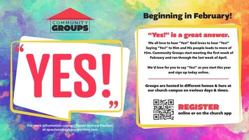 "Yes!" is a great answer. We all love to hear "Yes!" God loves to hear "Yes!". Saying "Yes!" to Him and His people leads to more of Him. Community Groups are start meeting the first week of February and run through the last week of April. There are all kinds of groups meeting at different times. We'd love for you to say Yes! as you start this year and sign up today online.