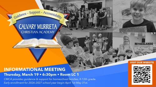We have had been blessed to have a homeschool ministry, Calvary Murrieta Christian Academy, for many years and are glad to be able to continue this with a closer relationship to the church. CMCA provides community, guidance and support for families home schooling their K-12th grade students. If you are interested in becoming part of this community, we would love to invite you to an information meeting on Thursday, March 19th at 6:30 in Learning Center 1. Early Enrollment for the 2026-2027 school year will begin April 1st through May 31st.