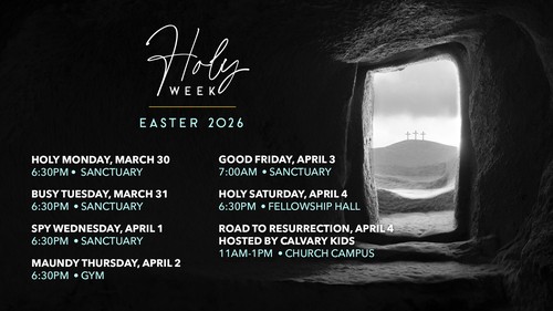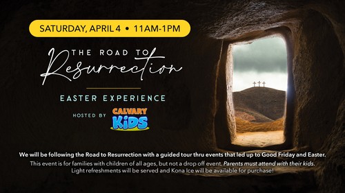 - Road to Resurrection (Hosted by Calvary Kids), April 4 at 11:00am at the Church Campus