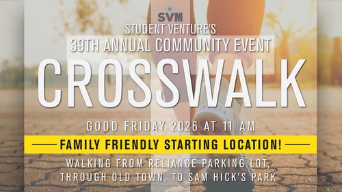 Student Venture is having their 39th Annual Community Crosswalk starting at a family-friendly location! We will gather for prayer in front of Reliance Church parking lot. From there, we will begin our 0.9 mile walk on Santiago Rd., to Front St., through Old Town, to our destination of Sam Hick's Park where we will have a praise and worship celebration! Shuttles back to the parking lot will be available!