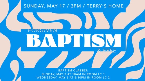 Please mark your calendar for our upcoming baptism and baptism classes. Our baptism will be Sunday, May 17 at 3:00pm at the Terry's Home. Our baptism classes will be Sunday, May 3 at 10:00am in Room LC 1 or Wednesday, May 6 at 6:30pm in Room LC 2. If you are not getting baptized we would love to have you join us that day to support those who are!