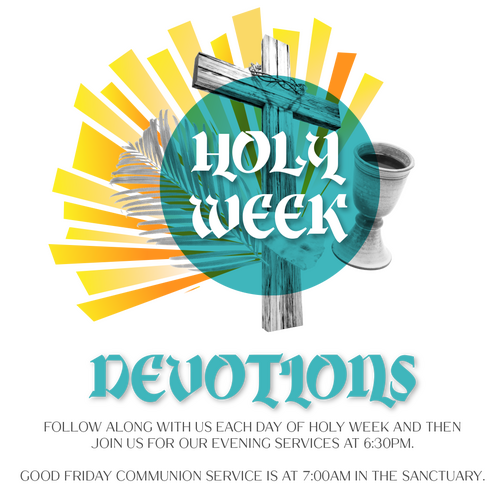 Take time each day this week to reflect on the moments that lead up to Jesus' death on the cross and resurrection. Then join us in the evenings in the Fellowship Hall for a time of reflection, worship, teaching and participation.