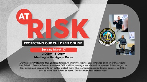 Please note that our June “At risk” meeting is cancelled due to Father’s Day. We will resume on July 18th from 3-5 in the Agape Room.