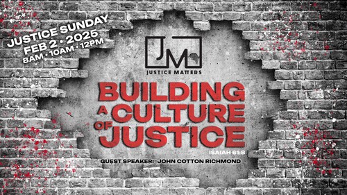 Mark your calendar for Justice Matters 15 on Sunday, Feb. 1st! John Cotton Richmond, who was supposed to be our speaker last year, got hurt 2 weeks before and wasn’t able to attend. Emily Milnes came instead and knocked it out of the park! But John is all healed up and ready to come back and share with us and we are excited! You’ll be hearing more in the months to come but save the date!