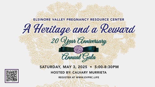 - Lake Elsinore Valley Pregnancy Resource Center: Sat. night, May 3rd from 5:00-8:30pm. We are hosting their Gala here at Calvary. To buy tickets or get more info, go to our website or to www.evpre.life