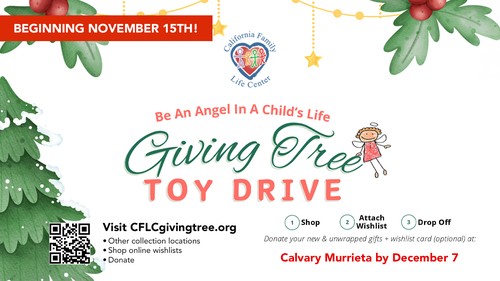 The Giving Tree Project for California Family Life Center is just around the corner! This is an opportunity to provide Christmas gifts for CFLC foster and kin care kids! It’s been such a blessing to be able to participate! They also have a wrapping party in December and I will send out the date for that soon! We will have our Christmas trees with the kid’s names and wish lists out beginning Sunday, November 15th! Go to CFLCgivingtree.org for more info!