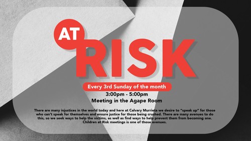 There are many injustices in the world today and here at Calvary Murrieta we desire to “speak up" for those who can’t speak for themselves and ensure justice for those being crushed. There are many avenues to do this, so we seek ways to help the victims, as well as find ways to help prevent them from becoming one. At Risk meetings is one of those avenues.