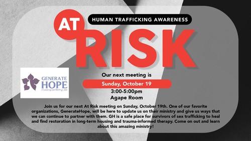 Join us for our next At Risk meeting on Sunday, October 19th. One of our favorite organizations , GenerateHope, will be here to update us on their ministry and give us ways that we can continue to partner with them. GH is a safe place for survivors of sex trafficking to heal and find restoration in long-term housing and trauma-informed therapy. Come on out and learn about this amazing ministry!