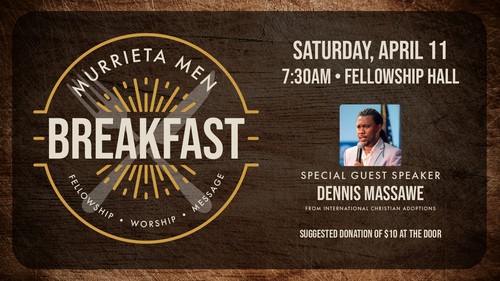 Join us for a Men's Breakfast on Saturday, January 10, from 7:30-9:00am in the Fellowship Hall! Our guest speaker will be Dennis Massawe from International Christian Adoptions. Come out on out and enjoy a time of fellowship, breakfast, and an encouraging message. There is a $10 suggested donation at the door and men of all ages are invited.