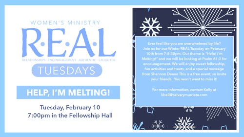 Ever feel like you are overwhelmed by life? Join us for our Winter REAL Tuesday on February 10th from 7:00-8:30pm. Our theme is “Help! I’m Melting!” and we will be looking at Psalm 61:2 for encouragement. We will enjoy sweet fellowship, fun activities and treats, and a special message from Shannon Deane. This is a free event, so invite your friends. You won’t want to miss it!